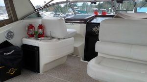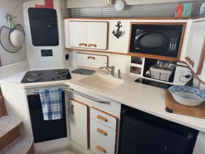 This Sea Ray model is an oversized 35 foot express cruiser built on a deep V hull. A spacious cockpit has a double helm seat forward, an aft-facing double cockpit seat, and a bench seat at the transom. The interior features a large semi-circular sofa that converts into a double berth, a forward offset double master stateroom with privacy curtain, a vanity, and easy access to the head that is complete with a stand up shower stall. A neutral decor and ample light make it bright and airy. The galley is well equipped with a 3burner stovetop, refrigerator, Master Chef microwave and integrated sink with a corian like countertop. Many improvements and upgrades.