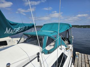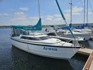 A boat famous for its versatility with the convenience of its own trailer. 6′ interior headroom, sails and motors quickly (12 mph). Trailerable, go sailing anywhere. Sleeps 6 (2 smaller sailors in bow V-berth, 2 main cabin, 2 in stern under cockpit.