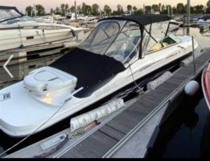 The sporty Rinker 262SC Captiva is well designed for water activities and entertainment. The cockpit has a wraparound lounge seating, wetbar, new vinyl, new carpet and transom door leading to an oversized swim platform. Interior features include a nicely appointed cuddy V-berth with Dometic porta potti (new and unused) hanging locker, seating area and window coverings. Epoxy bottom newly applied and boat detailed. Yearly maintenance with some improvements. EAGLE DUAL AXLE Heavy Duty Trailer Included.