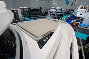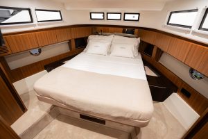 Powered by twin 250 hp diesels, the projected top speed is 25 knots. The H-Drive 6G option enables the Greenline 42 to operate on electric only at 6.5 knots. Additionally, 10 solar panels on the Greenline 42’s hardtop reportedly produce up to 4.3kW to power onboard systems and battery recharging.”